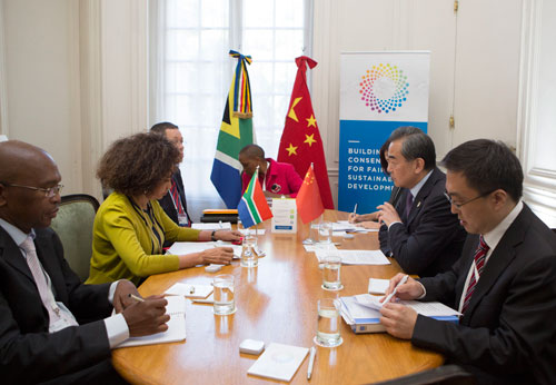 王毅表示,中南作为重要发展中大国和新兴市场国家,在国际和地区事务中发挥着重要作用,保持着密切协作。中南关系的战略意涵已超越双边范畴,具有全球性影响。中方愿与南非密切沟通协作,有力维护发展中国家的团结和合作,推动完善全球治理体系。中方始终从战略高度和长远角度看待中南关系,致力于进一步发展同南方“同志加兄弟”友好关系。今年是中南建交20周年,是中南关系承前启后的重要一年,双方将有一系列重要外交议程。中方将全力支持南成功举办金砖国家领导人会晤,确保中国领导人出席金砖国家领导人会晤并访南取得圆满成功,使之成为成为中南关系的又一重要里程碑,有力引领中南关系发展方向。