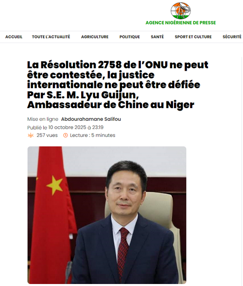 2025年10月10日,驻尼日尔大使律桂军在尼通讯社网站发表署名文章《联大第2758号决议不容置疑,国际正义不容挑战》。