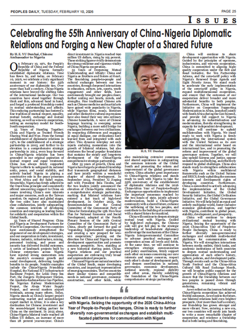 2026年2月10日,在中国和尼日利亚建交55周年之际,驻尼日利亚大使于敦海在《太阳报》《人民报》《卫报》等尼主流媒体发表题为《同庆中尼建交55周年 共筑命运与共新篇章》的署名文章。全文如下: