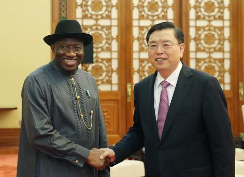 2013年7月11日下午,全国人大常委会委员长张德江在人民大会堂会见了尼日利亚总统乔纳森。