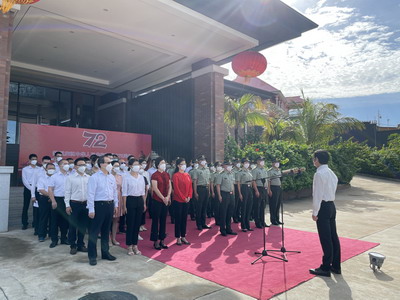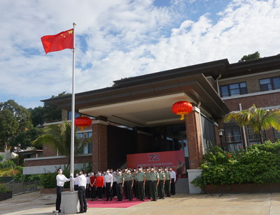 2021年10月1日,驻塞拉利昂使馆举行国庆升旗仪式,热烈庆祝中华人民共和国成立72周年。驻塞拉利昂大使胡张良和全体馆员、第五批援塞军事医学专家组成员列队肃立,齐声高唱《义勇军进行曲》,向冉冉升起的鲜艳五星红旗行注目礼和军礼,祝伟大祖国繁荣昌盛。