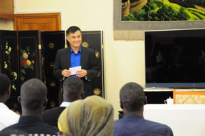 张迅大使首先向27名奖学金新生表示祝贺。他表示,2018年是中国改革开放40周年,40年间中国经济社会发生了翻天覆地的变化,取得了举世瞩目的成就,为包括塞在内的广大发展中国家带来了希望,也提供了借鉴。近年来,中塞关系稳步发展,成果丰硕,习近平主席在两周前刚刚对塞进行了国事访问,此访为中塞关系的发展注入了新的动力。张大使表示,青年是国家的未来,祝愿同学们在华生活、学习愉快,希望大家珍惜赴华留学机会,刻苦学习,学成归来后为塞内加尔的振兴和中塞友谊的发展做出贡献。