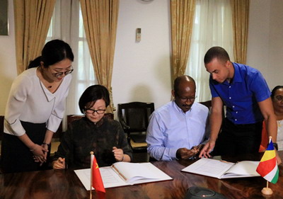 2019年6月19日,新的《中塞经济技术合作协定》(以下简称“《协定》”)在塞舌尔首都维多利亚签署。驻塞舌尔大使郭玮与塞副总统文森特·梅里顿(Mr. Vincent Meriton)分别代表中塞双方签字,并做简短致辞。
