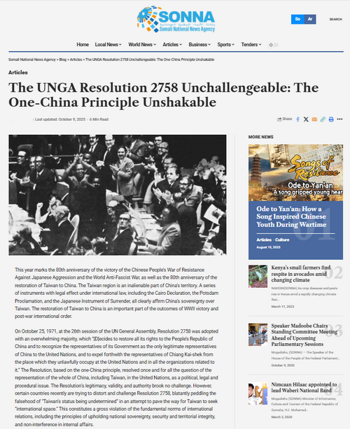 2025年10月9日,驻索马里大使王昱在索马里国家通讯社发表署名文章《联大第2758号决议不容挑战 一个中国原则无法撼动》。全文如下: