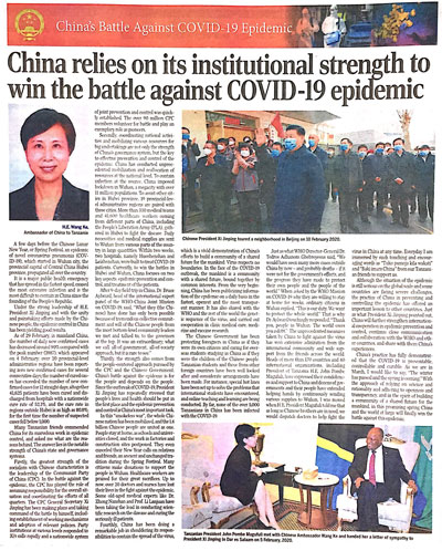 2020年3月3日和4日,坦主流大报《公民报》和《大众报》分别刊发“中国抗击新冠肺炎疫情”英语和斯瓦希里语专刊,驻坦桑尼亚大使王克发表了题为《中国依靠制度优势打赢疫情防控阻击战》的署名文章。全文如下: