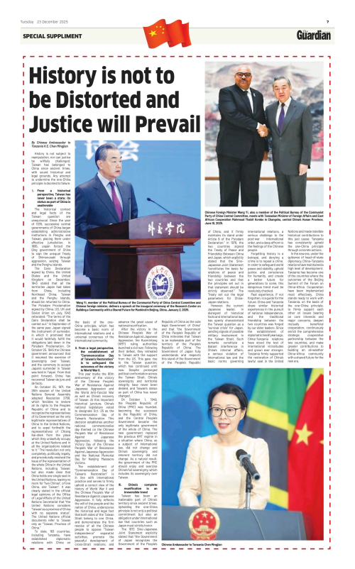 2025年12月23日,驻坦桑尼亚大使陈明健在坦桑尼亚主流媒体《卫报》发表署名文章《史不容改、理自昭明》,讲清台湾问题的历史经纬和法理事实,揭批外部势力涉台错误言论,宣介一个中国原则。全文如下: