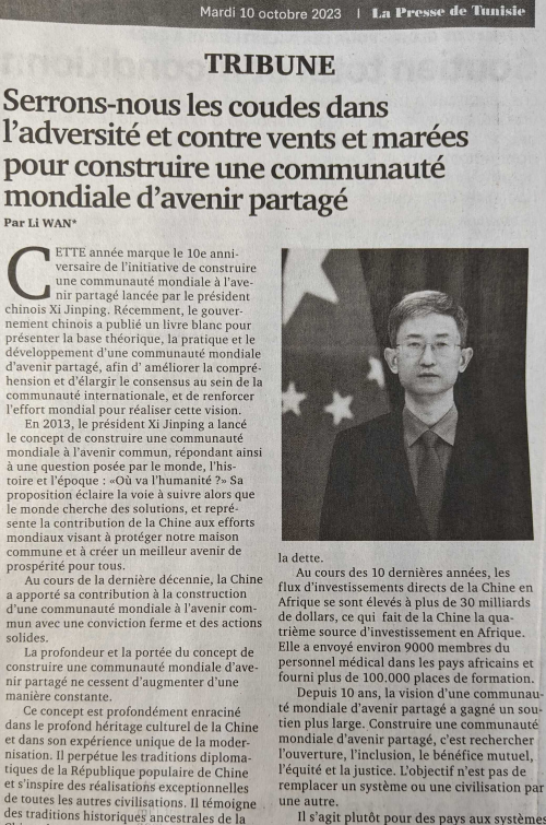 2023年10月10日,驻突尼斯大使万黎在突官方媒体《新闻报》发表题为《风雨同舟,携手共建人类命运共同体》的署名文章,深入阐释构建人类命运共同体的思想内涵,宣介中方积极推动构建人类命运共同体取得的累累硕果,展望中突合作光明前景。全文如下: