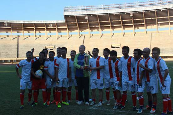 比赛前,现场观众一起高唱国歌,并向抗日战争中牺牲的人民英雄及死难同胞默哀致敬。比赛历时90分钟,运动员们在球场上奋力拼搏,赢得观众阵阵喝彩。比赛结束后,赵大使向乌干达华人足球队颁发了纪念奖杯。
