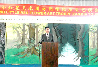 驻赞比亚大使杨优明在致辞中介绍了近年来中赞文化领域交流成果,表示伦古总统前不久对中国成功进行国事访问,为两国传统友谊和务实合作注入了新的动力和活力。中赞文化交流日益密切,为增进两国人民友谊发挥着不可替代的作用。小红花艺术团此次演出是南京市与赞比亚为期两年文化交流的重要组成部分,有助于进一步增进中赞两国人民,尤其是两国下一代的友好情谊。