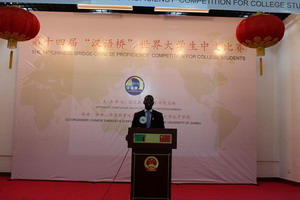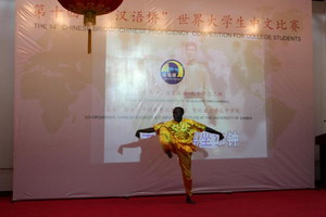 比赛以“我的中国梦”为主题设置主题演讲、即兴问答、才艺展示三个版块,选手们通过深情的朗诵、机智的答辩、欢快的歌舞、武术等才艺表演抒发对中国文化的理解和热爱,现场观众掌声不断,高潮迭起。最终来自穆隆古希大学的约瑟夫和来自赞比亚大学的祖鲁分别斩获特等奖和一等奖,并将于今年7月代表赞比亚赴长沙参加“汉语桥”全球总决赛。