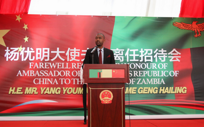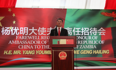 2018年4月10日,驻赞比亚大使杨优明夫妇在使馆举行离任招待会。赞方主宾、地方政府部长姆瓦勒、司法部长卢宾达、卫生部长奇卢菲亚、执政党爱国阵线总书记姆维拉、内阁副秘书长姆翁加、前外长姆旺加、前财政部长契克万达等政要、智库、非政府机构和媒体等各界人士、驻赞使节和国际组织负责人以及在赞中资机构和华侨华人代表300余人出席。