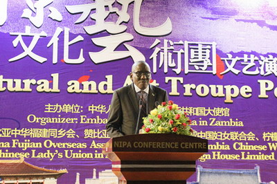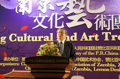 2018年4月24日,由驻赞比亚使馆主办,赞比亚中华福建同乡会、赞比亚中国武术协会、赞比亚中国妇女联合会等联合承办的南京文化艺术团访赞文艺演出在卢萨卡隆重举行。赞比亚旅游与艺术部长班达、驻赞比亚使馆临时代办陈世杰、赞多位高官和议员、各国驻赞使节和国际组织代表、华侨华人和中资机构代表500余人出席。