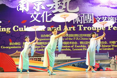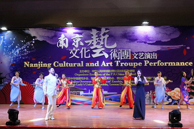 南京艺术团为观众们献上一场融汇中国传统乐器演奏、现代歌舞和赞当地歌曲的精彩表演。演出临近结束时,班达部长等赞方贵宾上台与演员同声高唱由赞开国总统卡翁达创作的《团结歌》,将现场气氛推向高潮,演出取得圆满成功。