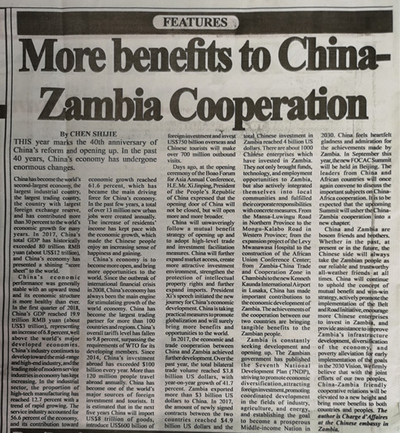 文章最后强调,当前中赞经贸合作深入发展,两国合作成果正在为赞民众带来实实在在的好处。中国将继续秉持互利共赢理念,积极推进“一带一路”倡议在赞落地,鼓励更多中资企业来赞投资,助赞不断提升基础设施建设水平,促进经济多元化进程和减贫,早日实现2030年愿景。今年9月,中非合作论坛新一届峰会将在北京召开,中国和非洲国家领导人将再次齐聚一堂,共商中非合作大计。相信新一届峰会将开启中赞合作新的历史篇章,在两国人民共同努力下,中赞友好合作关系将会迈上新台阶,更好造福两国和两国人民。