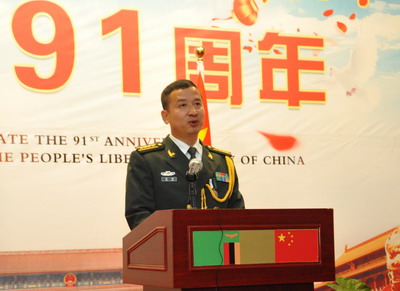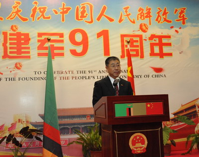 2018年7月24日晚,驻赞比亚使馆举办招待会,隆重庆祝中国人民解放军建军91周年。驻赞比亚大使李杰夫妇率全体外交官,中国援赞军医组和医疗队,在赞中资机构和华侨华人代表,赞比亚国防部长戴维斯·查马,司法部长吉文·卢宾达,陆军副司令兼参谋长米提少将,警察保卫部队警监卢哈纳、狱警部队副警监奇塞拉等20余位高级军官和警官,多位驻赞比亚使节和驻赞比亚使馆武官,部分使团外交官和政府官员及社会人士代表共约280人出席。