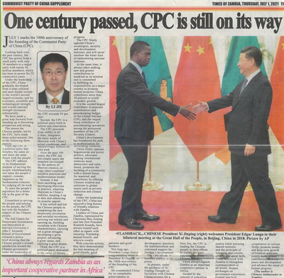 2021年7月1日,驻赞比亚大使李杰在赞主流媒体《赞比亚时报》发表题为《百年征程,仍在路上》的署名文章,分享中国共产党领导中国人民取得伟大成就过程中所积累三方面经验,表达对中赞友谊珍视和加强中赞合作期望。全文如下: