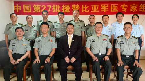2024年9月12日,驻赞比亚大使韩镜来到第27批援赞军事医疗专家组驻地,看望慰问全体官兵,向大家致以诚挚问候和中秋祝福。