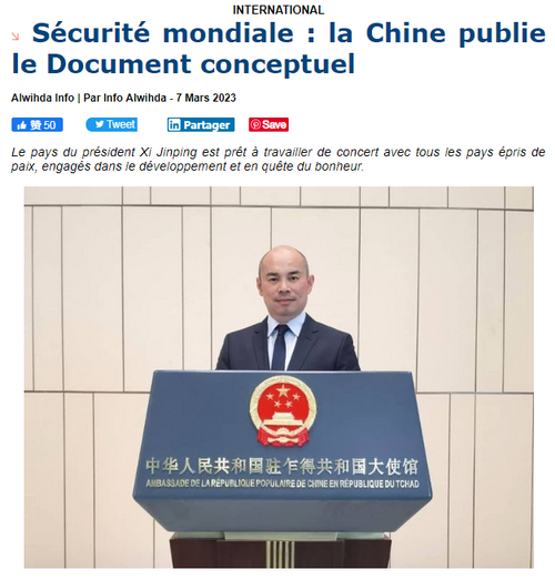 2023年3月7日,驻乍得大使王晰宁在乍官方纸媒《信息报》和最大新闻媒体门户网站“团结网”发表题为《全球安全倡议:携手共建和平安宁的世界》的署名文章。全文如下: