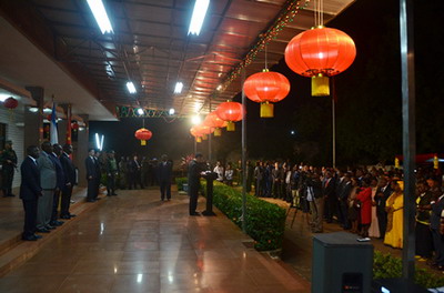 招待会历时两个多小时,始终洋溢着热烈友好的气氛。高悬的大红灯笼和流光异彩的霓虹灯呈现出一派节日的景象。欢快的乐曲声中,中外宾朋举杯共贺新中国成立67周年,祝愿中国更加繁荣昌盛,中国同中非友谊长青、合作长存。