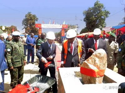 中非共和国总统图瓦德拉(中)和中国驻中非大使马福林为项目奠基