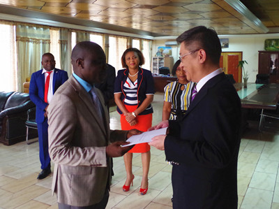 2018年4月24日,新任驻中非大使陈栋向中非外交与海外侨民部部长杜巴纳递交国书副本,中非外交部经济顾问、外事顾问、政治总司长等出席递交仪式。