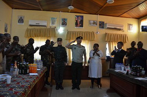 陈大使与在场军官一一握手、亲切交谈,酒会现场气氛热烈、轻松愉快。