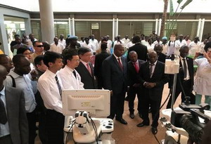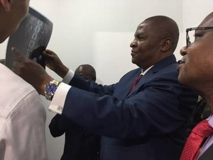 签字仪式后,中非友谊医院院长帕斯卡尔·姆贝雷索介绍此批由中国政府捐助的设备主要包括大型数字化DR、彩色多普勒超声仪、麻醉机、呼吸机等最新医疗设备。索姆塞部长听取介绍后表示,这些设备目前在中非是最好的设备,装配后的友谊医院也成为中非最先进、最现代化的医院。随后图瓦德拉总统在陈大使、索姆塞部长陪同下,参观了彩色多普勒超声仪及胃肠镜工作现场、放射机房和中国医疗队员工作的诊室。图瓦德拉总统高度赞扬中国政府长期以来对中非医疗卫生事业不遗余力的支持和帮助,感谢中国医生不远万里来到中非,为中非人民的健康而辛勤工作,他要求医院利用好这些药械,造福更多的中非人民。