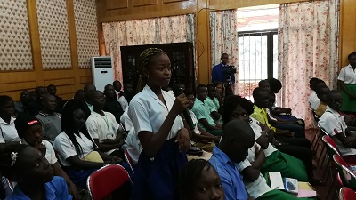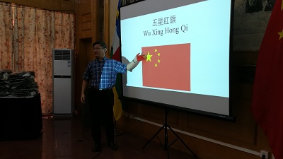 颁奖仪式结束后,中非班吉大学友华教师小组介绍了走进班吉十五所中学宣讲中国文化的成果情况。为测验同学们学习成果,本次主题活动设置了中国知识竞猜环节。同学们个个积极参加、踊跃答题,当屏幕上出现“熊猫”“北京”等汉字与拼音时,学生们也饶有兴趣地齐声朗读。