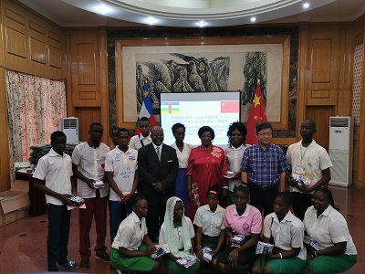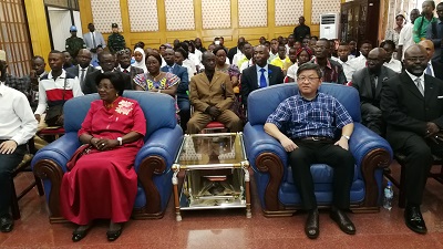 活动现场气氛热烈,图瓦德拉总统夫人特意身着一袭中式旗袍参加活动。首先举行了“中国—中非命运共同体中国大使奖学金”颁奖仪式。由班吉大学推荐的30名品学兼优的学生走到台前。图瓦德拉总统夫人、陈栋大使与班吉大学校长依次向30名获奖学生发奖,并致以热烈的祝贺。