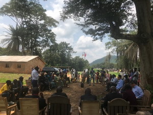 随后,所有与会人员围坐树下,陈大使介绍了习近平主席在中非合作论坛北京峰会上提出的“构建更加紧密的中非命运共同体”理念、菌草技术推广等合作项目以及庆祝中华人民共和国成立70周年相关活动安排。陈大使亲切地向在场民众表示,中国大使馆将继续走进中非基层村庄,在农业、卫生、教育、青年等涉及民生领域开展更多项目,推动两国合作惠及更多中非百姓。
