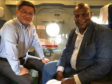经过近1小时飞行,上午9时30分,图瓦德拉总统与陈大使乘坐联合国维和部队飞机同机抵达班巴里市,受到当地官员和现场数千民众热烈欢迎,很多民众身着印有中法两种文字的“庆祝中华人民共和国成立70周年”和“构建更加紧密的中国—中非命运共同体”文化衫,欢迎中国大使到来。