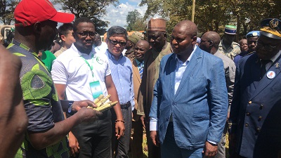 之后,图瓦德拉总统和陈大使一行来到市政厅前,听取曾赴华学习菌草技术的优秀中非学员代表介绍班巴里菌草技术推广情况。图瓦德拉总统、恩贡议长、恩格雷巴达总理、陈大使各自种下巨菌草,埋入菌草菇袋,标志着菌草技术正式在中非内地落地。随后,图瓦德拉总统和陈大使共同向班巴里市移交了中国政府提供的粮援,用于援助受当地战乱影响迁徙于此地的难民。