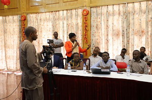 陈栋大使和索姆塞卫生部长首先代表两国政府签署中国援中非抗疟药品交接证书,简短的签字仪式旨在向来宾传递传染病威胁也不能阻断两国合作的强烈信息。随后播放的中国抗击新冠肺炎疫情的视频短片,全方位展示了中国政府和人民全力以赴抗击疫情的场景,引起现场记者强烈共鸣。