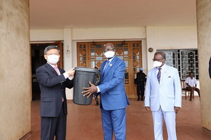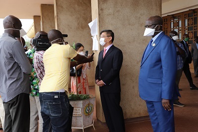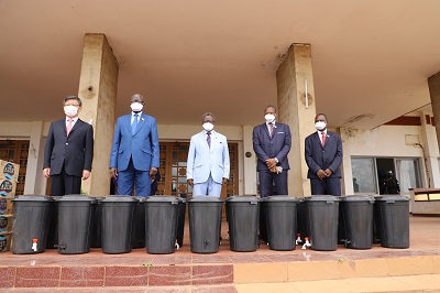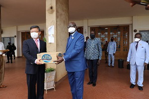 仪式上,中非议长恩贡代表巴布阿村、国民议会友华小组主席马康戈代表巴冈杜村、议员纳利代表盖灵古村从陈栋大使手中接过卫生防疫用品,大家并合影留念。