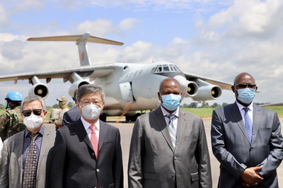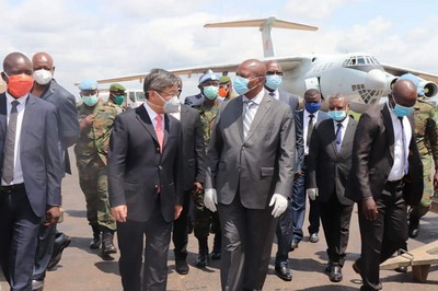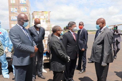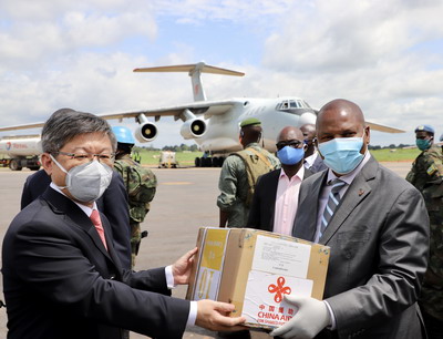 2020年6月11日,中国政府第二批援中非共和国抗疫物资移交仪式在班吉国际机场举行。中非总统图瓦德拉、驻中非大使陈栋、中非卫生部长索姆塞、经济合作部长莫鲁瓦、世卫组织驻中非代表塞兰德等出席。