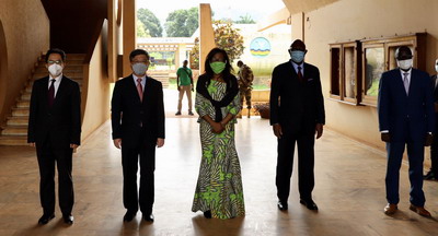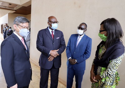 仪式现场,陈大使向拜波外长移交由福建省人民对外友好协会捐赠的防疫用品,并与拜波、莫卢瓦、费祖雷等部长共同查看物资。