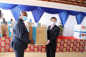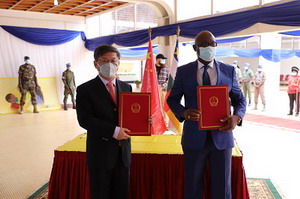 仪式上,陈栋大使向图瓦德拉总统移交中国援中非选举第一批物资和抗疫物资,并与中非计划部长莫鲁瓦分别代表两国政府签署关于中国温州医科大学附属第一医院与中非友谊医院建立对口合作机制的意向书。