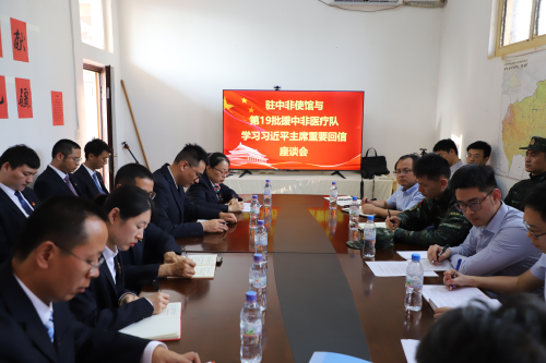 2023年2月10日,驻中非使馆和第19批援中非中国医疗队在医疗队队部举行座谈会,认真学习领会和贯彻落实习近平总书记2月9日致医疗队队员的重要回信精神。座谈会由驻中非大使李钦峰主持,使馆和医疗队全体同志出席。