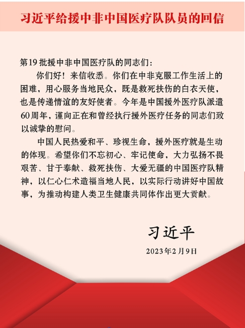 回望过去一年,在两国元首的战略引领下,在人类命运共同体理念指引下,我们的铁杆友谊更“铁”,务实合作更“密”,人文交流更“亲”。在基础设施、能源电力、科教文卫等领域,我们又有新的重要合作项目在中非落地,助力中非百姓告别熬枯受淡,迈向安富尊荣。尤其值得的一提的是,两国医疗卫生领域合作不断结出新的硕果。2月9日,习近平主席给第19批援中非中国医疗队队员们回信,勉励他们以仁心仁术造福当地百姓。12月19日,图瓦德拉总统授予他们中非国家荣誉勋章。两国元首的关心关爱,令广大致力于两国友好合作的各界朋友们备受鼓舞。