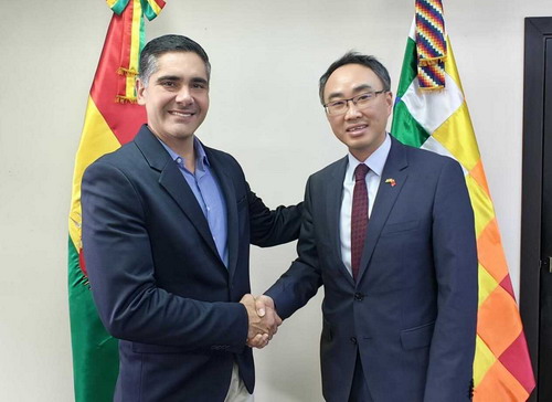 胡表示玻新政府高度重视发展对华关系,愿同中方一道深挖合作潜力,优化农业和水资源开发,扩大玻特色产品对华出口,并促进两国商企界交流对接。