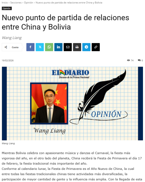 2026年2月16日,驻玻利维亚大使王亮在玻主流媒体《理性报》《日报》《时代报》发表题为《共庆中国年,中玻关系迎接新开端》的署名文章。
