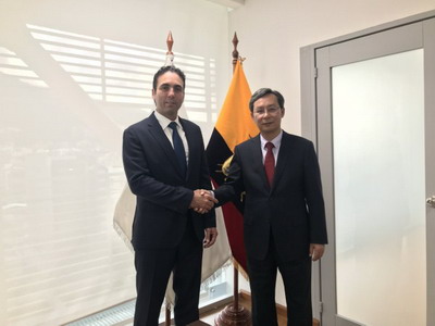 2018年11月28日下午,驻厄瓜多尔大使王玉林会见厄瓜多尔生产、外贸、投资和渔业部长坎帕纳,双方就中厄经贸领域务实合作交换意见。