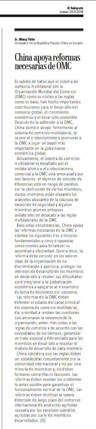 2018年11月29日,驻厄瓜多尔大使王玉林在厄瓜多尔主流媒体《电讯报》发表题为《中国支持对世贸组织进行必要改革》的署名文章。王大使在文中指出,当前世贸组织正面临三大危机,为此中国支持对世贸组织进行必要改革,以增强世贸组织的有效性和权威性。王大使简要介绍了中方提出的关于世贸组织改革的三个基本原则和五点主张,并指出,世贸组织改革事关广大发展中国家的切身利益,大家应团结起来,以保障自身利益和发展空间。王大使表示,中方关于世贸组织改革的立场反映了所有发展中国家共同诉求,也体现了中国作为世界上最大发展中国家和负责任大国的建设性姿态。我们将继续推动对世贸组织进行必要改革,以推动建设开放型世界经济、构建人类命运共同体。全文如下: