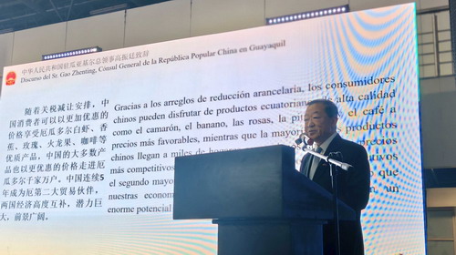 2025年9月25日,驻瓜亚基尔总领事高振廷出席厄中商会举办的第三届中国商品博览会商务峰会开幕式。高总领事、厄中商会主席凯塞多、厄生产外贸部副部长阿西瓦尔、瓜亚斯省督普拉萨致辞,各界来宾300余人出席。