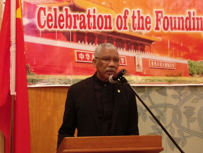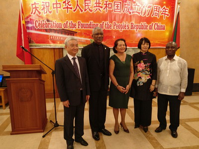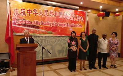 2016年9月30日,驻圭亚那使馆张灯结彩,驻圭亚那大使张利民和夫人刘悦女士举行招待会,隆重庆祝中华人民共和国成立67周年。圭总统格兰杰、代总理格里尼奇、财长乔丹、公共电信部长休斯、国民议会议长斯科兰特、人进党总书记罗西等政要及旅圭华侨华人、中资机构、孔子学院代表等150余人出席。
