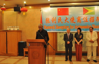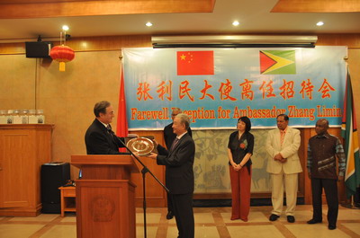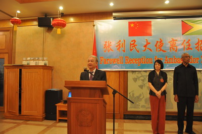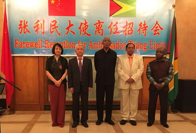 2016年11月25日,驻圭亚那大使张利民和夫人刘悦在使馆举行离任招待会。圭总统格兰杰、总理纳加穆图、国务部长哈蒙、外长格林尼奇、公共电信部长休斯、社区部长巴尔肯、农业部长霍尔德、人进党总书记罗西、前总统拉莫塔、前总理海因兹等政要及旅圭华侨华人、中资机构、医疗队代表等200余人出席。