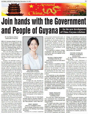 2021年11月10日,驻圭亚那大使郭海燕在《圭亚那纪事报》发表文章《携手圭亚那政府和人民,实现中圭关系新的发展》。全文如下: