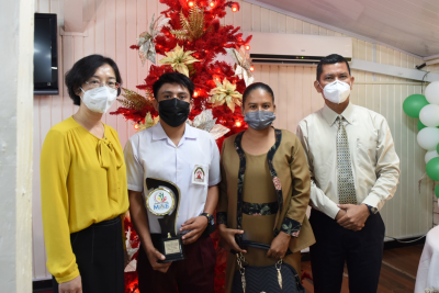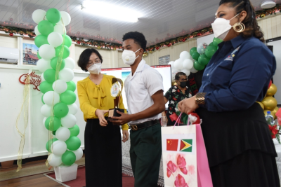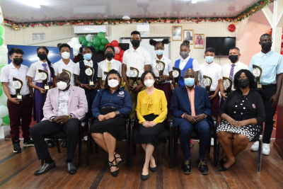 2021年12月17日,驻圭亚那使馆与圭教育部共同举办首届“中圭友谊青年领导力发展竞赛”颁奖典礼,驻圭亚那大使郭海燕、圭教育部长马尼克钱德、在线学习学院主任奥帕德义、首席教育官赫特森、教育部艺术司司长巴克-金、获奖学生及其老师、家长等出席。