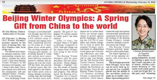 2022年2月16日,驻圭亚那大使郭海燕在《圭亚那纪事报》发表署名文章《北京冬奥会:中国送给世界的新春礼物》。全文如下: