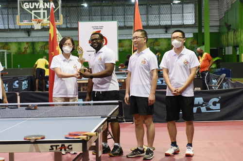 佩表示,圭中友谊早在首批华人抵圭时就已扎下了根。建交以后,圭各届政府都坚定奉行一个中国政策,双方不仅在政治、经济上联系紧密,也建立了深厚牢固的人民之间的友谊,今天的乒乓球赛就是一个实例。祝愿双方通过今天的“乒乓外交”互学互鉴、共同提高,让我们的友谊结出更多硕果。